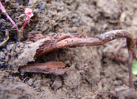 病菌在病根和土壤中越冬,第二年遇高溫高濕性氣候時(shí)發(fā)病。病菌經(jīng)工具、雨、水、害蟲(chóng)傳播,皮孔、傷口入侵。主要為害根。