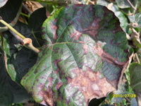 發(fā)病部位多從葉緣開(kāi)始,初期在葉緣出現(xiàn)水漬狀污綠色小點(diǎn),后期病斑沿著葉緣或向內(nèi)發(fā)展,形成不規(guī)則的病斑,并且病斑逐漸變?yōu)榛野咨“哌吘壋示G色。如果感染果面,則出現(xiàn)淡褐色小點(diǎn),最后呈不規(guī)則褐斑,果皮干腐,果肉腐爛。