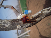 可在發(fā)病獼猴桃植株上發(fā)現(xiàn)病斑,病斑皮層隆起,組織變軟呈水漬狀,先為淡黃色,以后變?yōu)榧t褐色,病斑處出現(xiàn)小孔,流出白色液體,不久轉(zhuǎn)成鐵銹紅色,影響枝蔓營(yíng)養(yǎng)輸導(dǎo),使枝蔓上部的枝、葉、果生長(zhǎng)不良。
