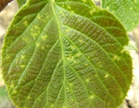 獼猴桃病毒病有獼猴桃花葉病。。表現(xiàn)為葉部有鮮黃色不規(guī)則線狀或片狀斑,病健部交界明顯,葉脈和脈間組織均可以發(fā)病,嚴(yán)重影響葉片的光合功能。