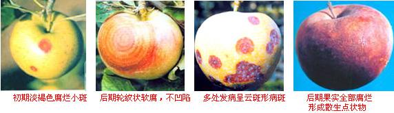 主要危害果實,也可侵染枝干和果臺。自病斑中心剖開果實,可見果肉自果面向果心成漏斗狀變褐腐爛。病組織帶有苦味。病斑邊緣紫紅色或黑褐色,中央凹陷,斑上黑色小點稀疏,呈同心輪紋狀排列,其下果肉局部壞死。枝干發病與果實癥狀相似。