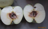 只危害果實。分為霉心型和心腐型。初期心室組織變褐壞死,后向外擴展,果肉變褐色或者深褐色,味苦,可從果柄洼出爛透。心室內充滿白色、黑褐色、青綠色或者粉紅色霉層,以粉紅色霉層最常見。幼果發病,內外常包敷紅粉。北斗、元帥系品種的病果易脫落,青香蕉的病幼果多在樹上變黃,國光則干縮成黑色小僵果,掛在樹上經冬不落。