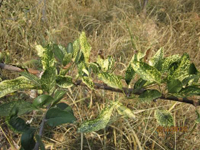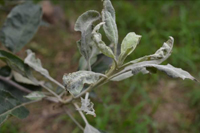 主要為害嫩枝、葉片、新梢,也為害花及幼果。病部滿布白粉是此病的主要特征。幼苗被害,葉片及嫩莖上產生灰白色斑塊,發病嚴重時葉片萎縮、卷曲、變褐、枯死,后期病部長出密集的小黑點。大樹被害,芽干癟尖瘦,春季發芽晚,節間短,病葉狹長,質硬而脆,葉緣上卷,直立不伸展,新梢滿覆白粉。生長期健葉被害則凹凸不平,葉綠素濃淡不勻,病葉皺縮扭曲,甚至枯死。