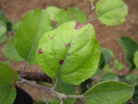 主要為害葉片,也為害嫩枝和果實。發病初期,葉片上出現褐色或深褐色小點,后擴大為直徑5-6毫米的病斑,周圍有紫紅色暈圈,邊緣清晰。天氣潮濕時,病斑上長出黑色霉層。幼葉被害,有時葉片呈畸形。為害嚴重時,被害葉干枯,提早脫落。果實被害,上生近似葉片上的斑點。枝條被害,也生褐色微凹陷的病斑,病斑周圍常產生裂紋。