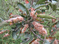 主要為害葉片,也能為害嫩枝、幼果和果柄 。葉片初患病正面出現油亮的橘紅色小斑點,逐漸擴大,形成圓形橙黃色的病斑,邊緣紅色。發病嚴重時,一張葉片出現幾十個病斑。發病1~2周后,病斑表面密生鮮黃色細小點粒,初為桔黃色,后變為黑色。病斑背面隆起,叢生淺黃色毛狀物。果實受害,初生黃色小點,后變褐色,病斑四周有與葉背相同的毛狀物。