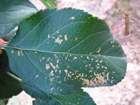 蘋果綿蚜一年發生8—9代,主要以一齡和少數二齡若蟲在樹體上群聚越冬。越冬的部位大多在中、下部的主枝和大枝上。在枝干上有愈傷組織、剪鋸口、皮隙縫等處或在根瘤上群集。越冬的成活率隨越冬群體的大小而不同,群體越大,成活率越高。來年春季,在4月初開始為害。5月上、中旬為田間蔓延階段,6月—7月中旬是該蟲大量繁殖,蔓延、擴散的重要時期,往往綿狀物累累全樹,造成嚴重為害。因此5月份蟲群尚未擴散是防治的關鍵時期。7月下旬—8月中旬蟲口數量迅速下降,其原因是高溫和寄生蜂的原故。