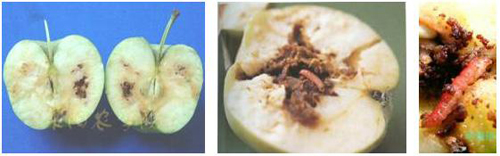 被害果果面有針頭大小的蛀(入)果孔,由孔流出淚珠狀汁液,干涸后呈白色蠟狀物。幼蟲取食果肉形成彎曲縱橫的蟲道,蟲糞留在果內呈“豆沙餡”狀。幼果被害后,生長發育不良,形成凹凸不平的“猴頭果”;后期受害的果實,果形變化不大;被害果大多有圓形幼蟲脫果孔,孔口常有少量蟲糞,由絲粘連。