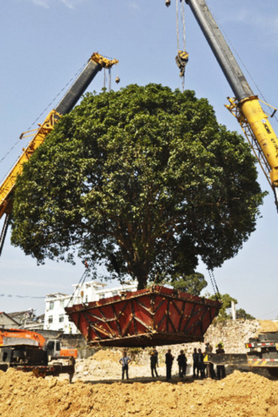 20名作業人員,連續一周的緊張工作,40余萬元搬家費用。2014年10月23日上午12時10分,在兩臺大型起重機巨臂的牽引下,總重達62噸的“桂花王”連同底部的箱梁緩緩落入預定的坑穴,岳西縣城居民廣泛關注的“桂花王”順利移動60余米,成功入住新家。