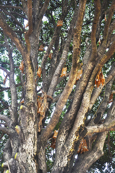 從10月15日開始開挖,到今天成功搬家,再到下一步的“生根發芽”,如何確保這棵桂花王順利適應新環境?來自四川農大的碩士王天龍介紹,從15日開始,技術人員定期往樹葉上噴灑抑制蒸騰劑,以減少水分蒸發。同時使用營業液為枝干補充能量。“目前我們使用的營養液已經超過300公斤,你看樹干上一袋袋,掛的都是營養液。”王天龍笑著說。