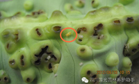 圖4.用藥前 圖5、用藥后(有效防治的表現(xiàn):老葉的“包狀物”不會(huì)消失,但其不再變大,且不穿孔;新葉在生長至老葉的過程中幾乎不再形成“包狀物”,恢復(fù)正常生長)